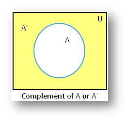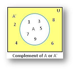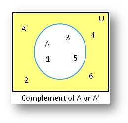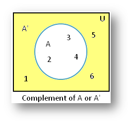 {2, 3, 4} then U – A = ~ A = A’ = {1, 5, 6}.